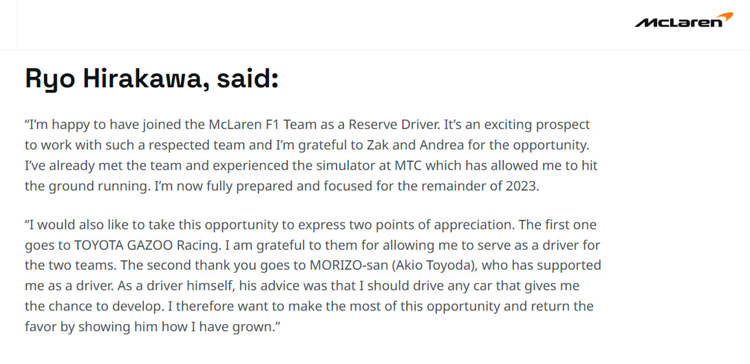在迈凯伦消息公开的新闻稿上,记载着平川的感言,其中也有着“对Morizo的感谢”,感谢的对象是“同为车手,给予我支持的Morizo先生”。