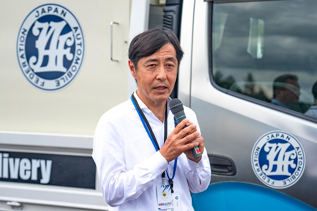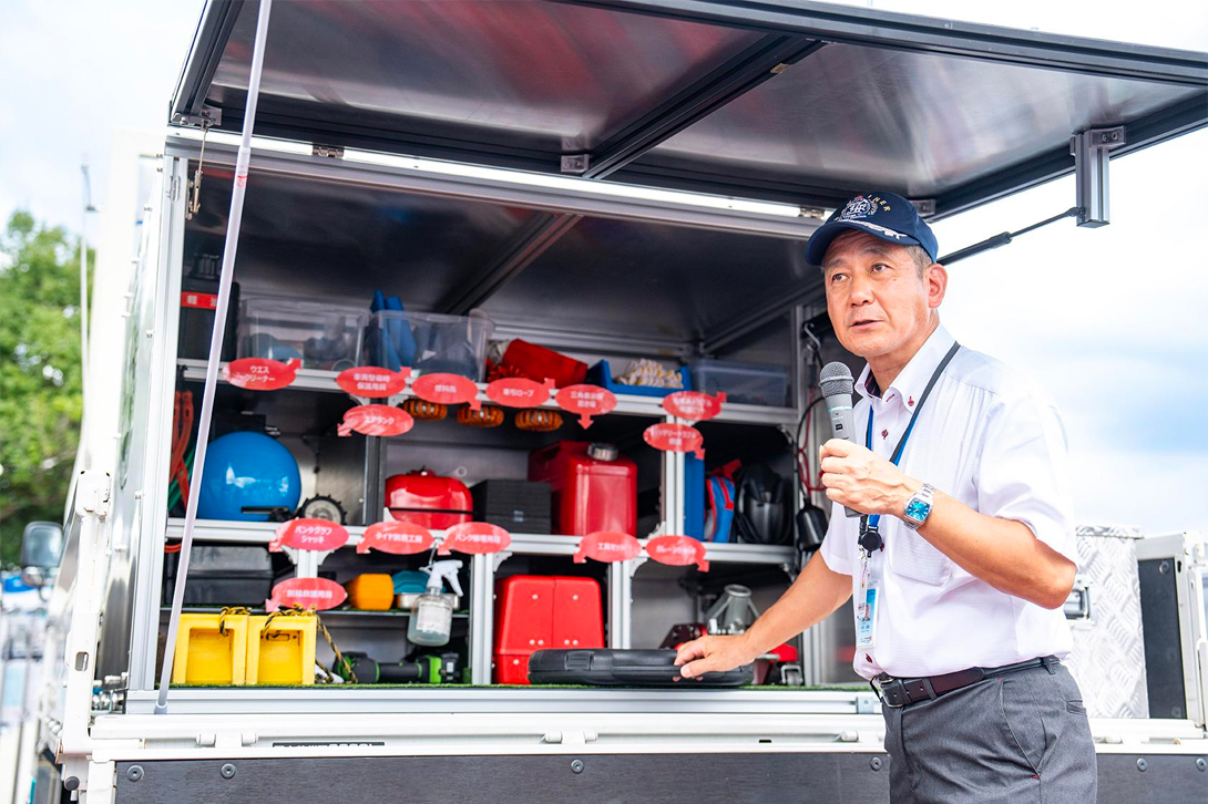 据说这辆道路服务加氢车是在耐力赛开始前两天才刚制造完成的。JAF道路服务部的武田高泰部长,针对该车型中JAF所坚持的部分进行了介绍。