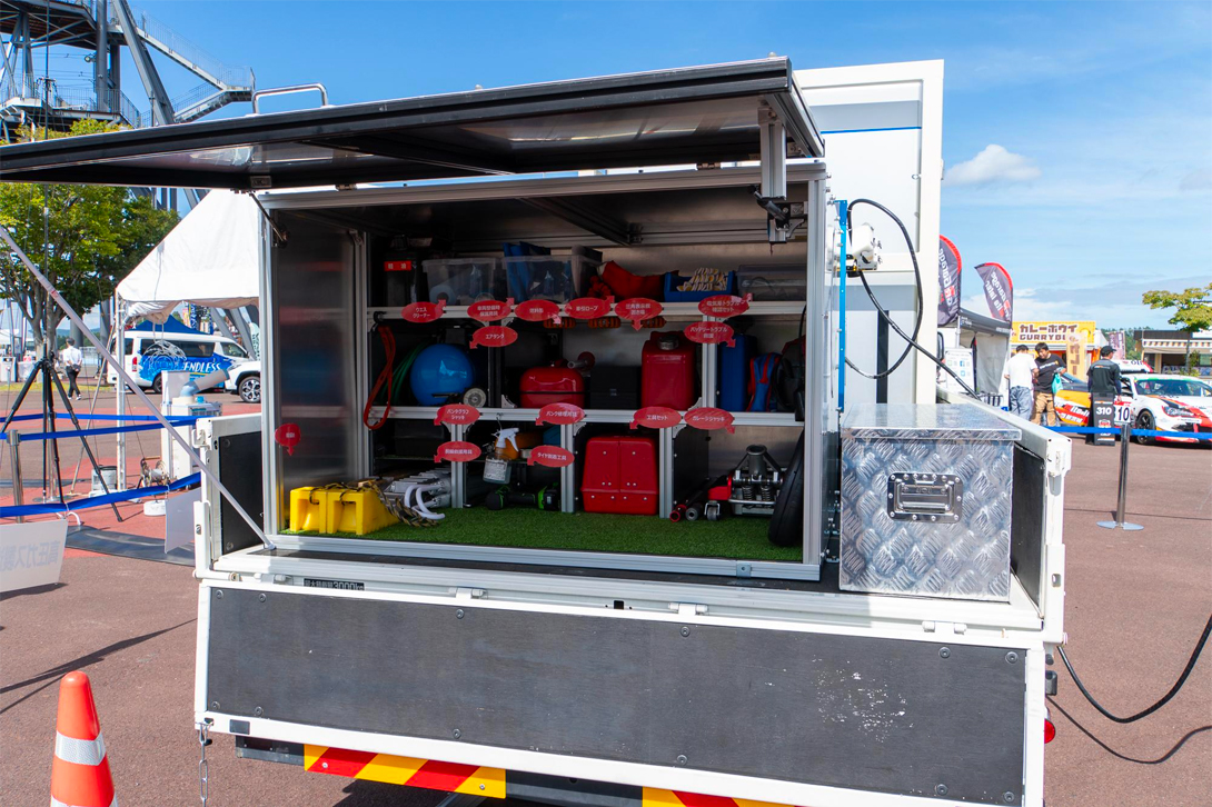 大型工具箱中配备了千斤顶、拖车绳、应对轮胎问题的储气罐、拆胎工具、脱轮急救包、普通汽油、高辛烷值汽油和轻油,可提供多种道路服务。