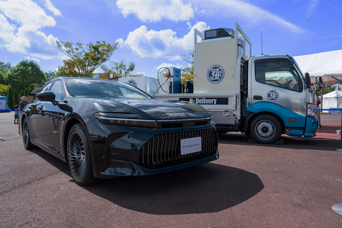 在道路服务车旁,首次公开的日本规格的CROWN SEDAN正在进行加氢演示。