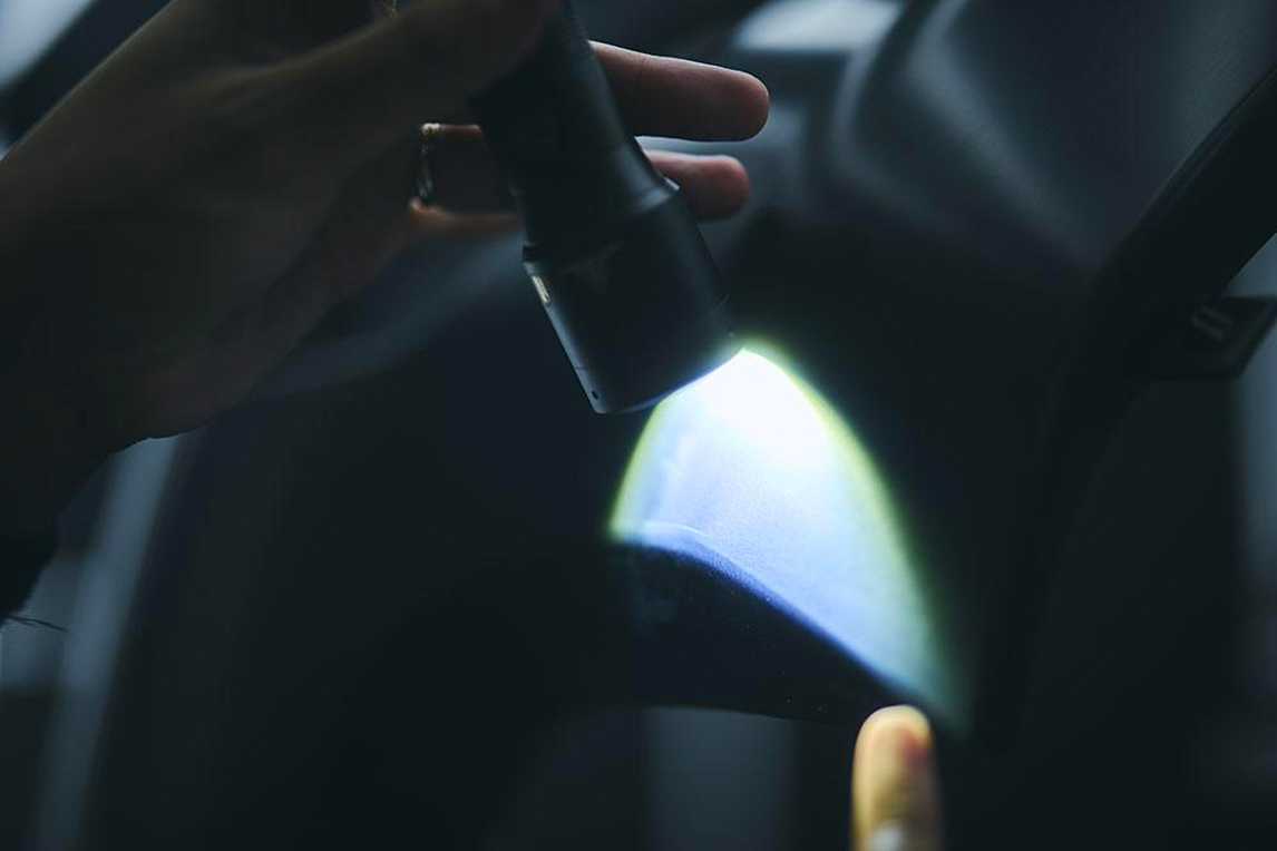 山中用手电筒照在打磨完成的物体表面,确认打磨完成度。