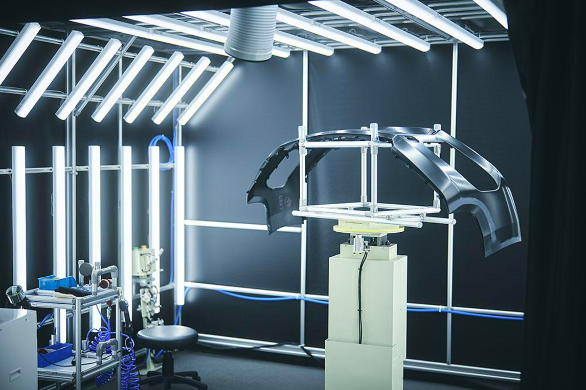 在山中的作业空间里,为了确认保险杠表面的光滑度,设置了完全平行且间隔均等的照明灯。