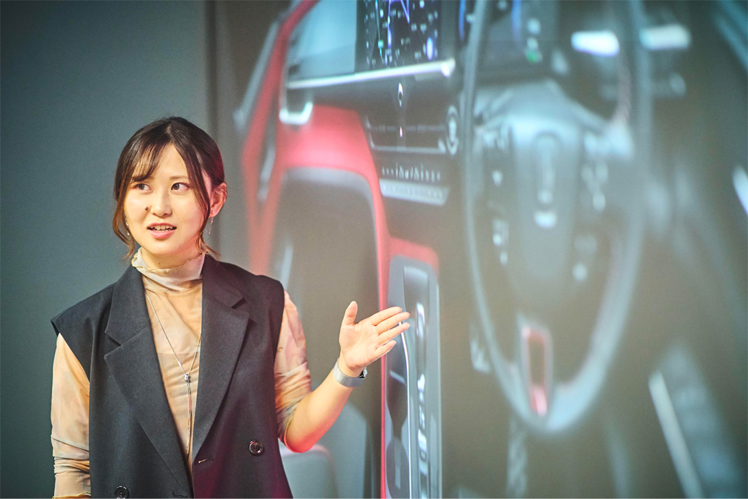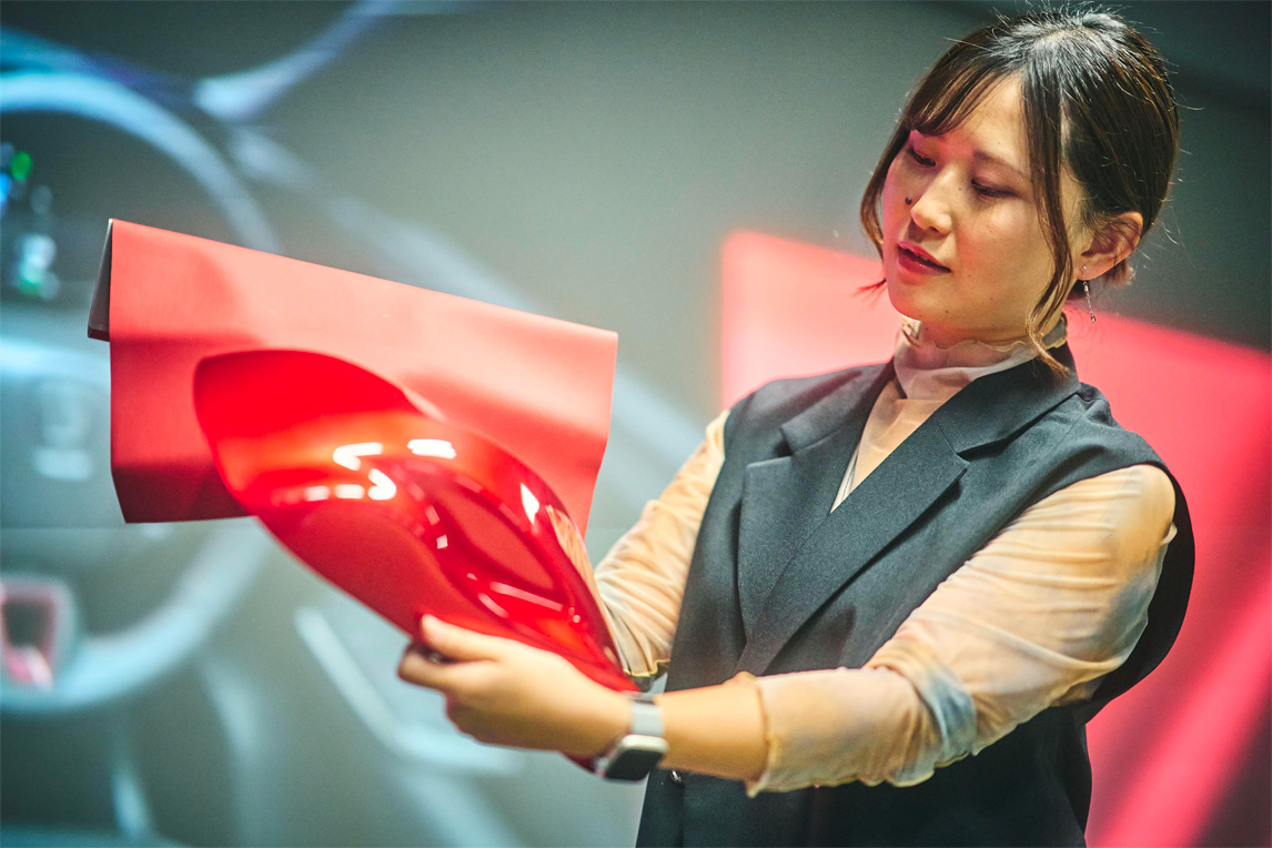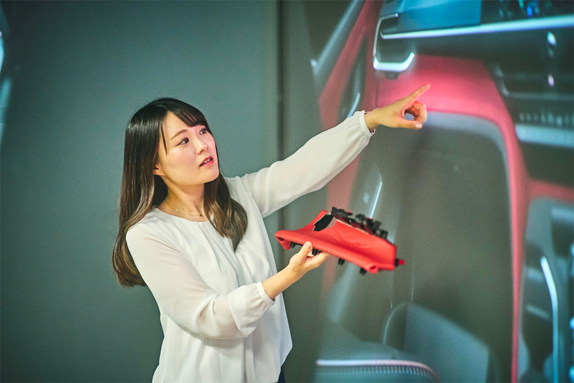 为让大家能在“驾乘”汽车时,惊呼“WOW”,研发人员们尝试挑战了“非对称内装”设计。隶属于汽车研发中心色彩&感性设计室的小林爱理,主要负责内饰表面处理与表皮设计工作。采访中,我们首先向她咨询了非对称内装的设计概念。