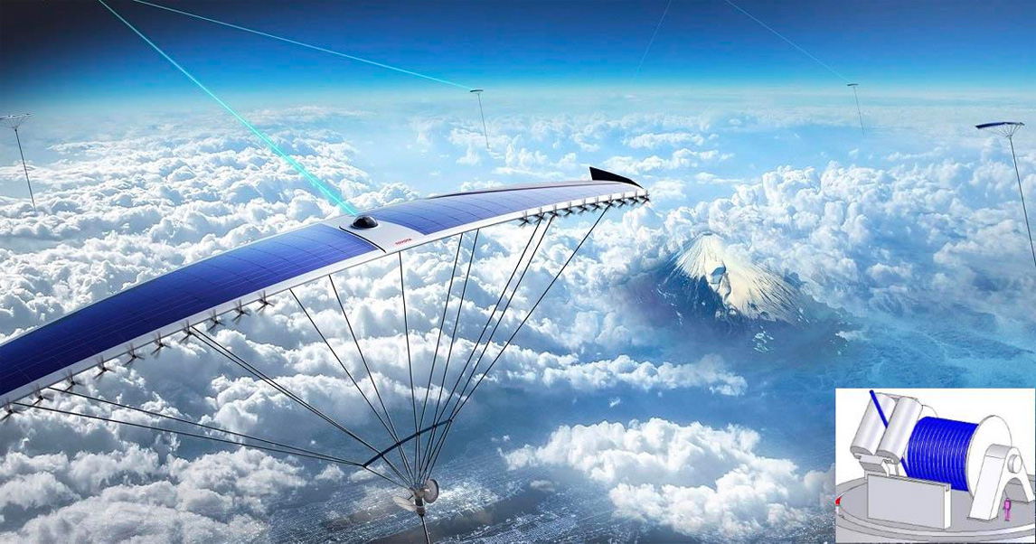 上图为该项目的最终图像。相邻的风筝通过线束相互连接,从地面吊起的货物在风筝之间运输。此外,它还可作为卫星光通信的中转站,利用高空优势与地面进行通信。