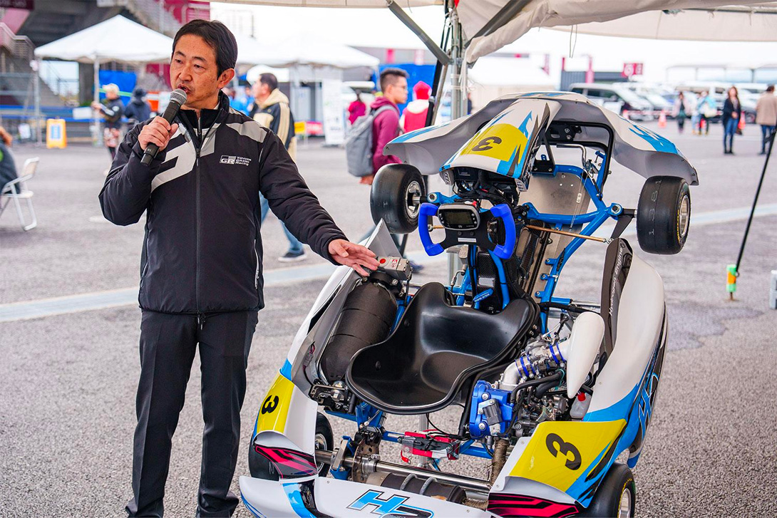 在活动广场,靠氢燃料发动机和碳中和燃料行驶的两辆卡丁车也首次亮相。GR车辆研发部的伊东直昭主查阐述了推出这两款卡丁车的目的。
