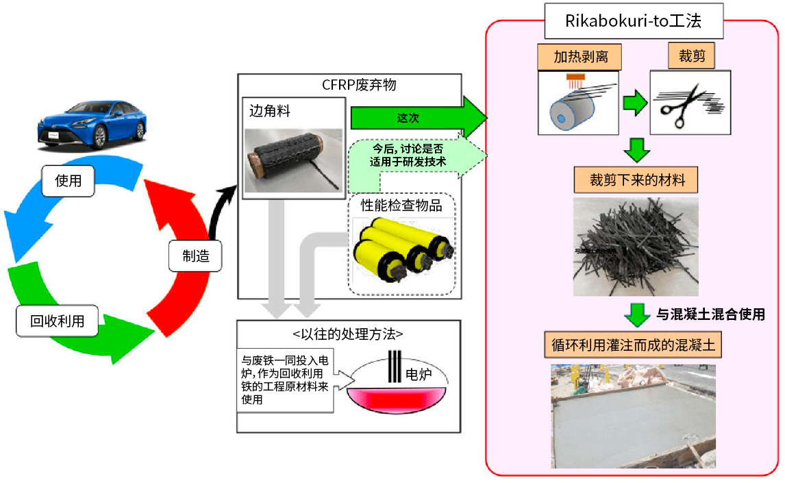 为了更有效地回收利用这种边角料,大林组和丰田共同研发了“Rikabokuri-to工法”。这种技术可以通过独特的热处理加工,将CFRP从制造储氢罐后树脂固化的边角料表面剥离出来。