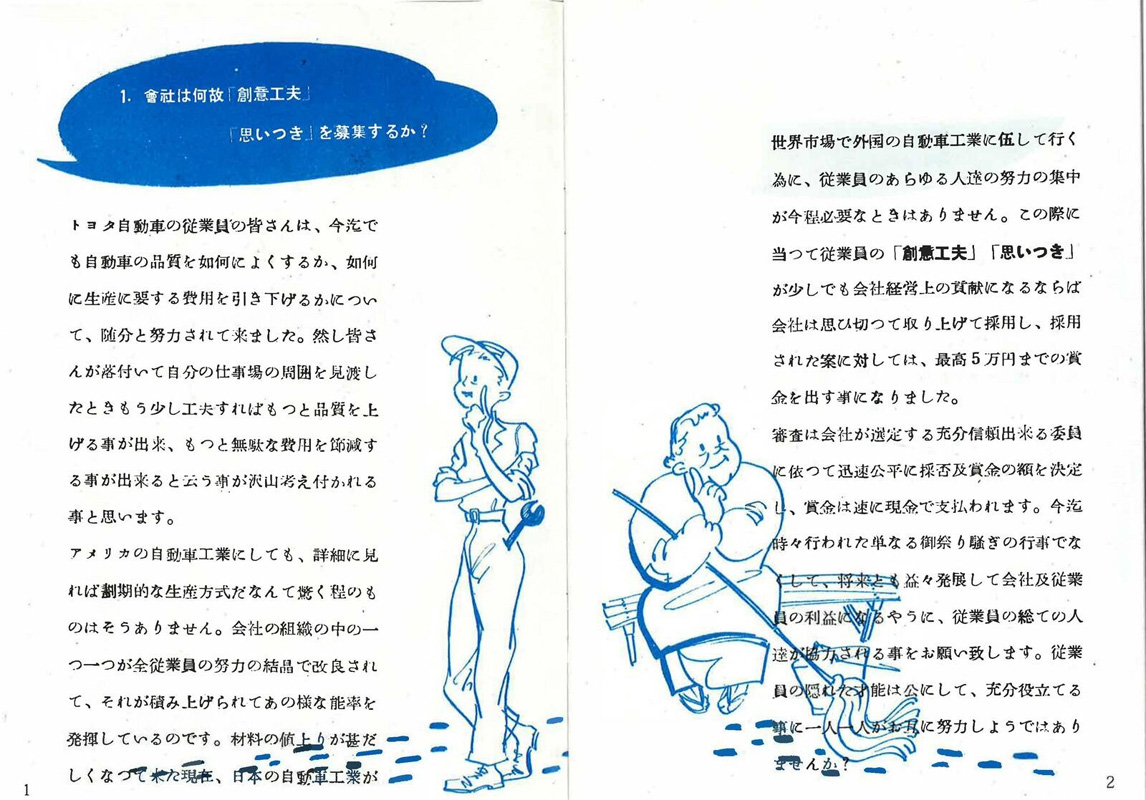 1951年正处于日本汽车产业拼尽全力挑战美国汽车三大巨头的时代。当时,丰田英二先生前往美国的福特工厂视察,看到他们的制造一线中有一种创意奖励金机制,名为“Suggestion system(提案制度)”。随后便将该制度作为标杆分析法的对象,引入后创建了丰田的“创意提案奖励制度”。