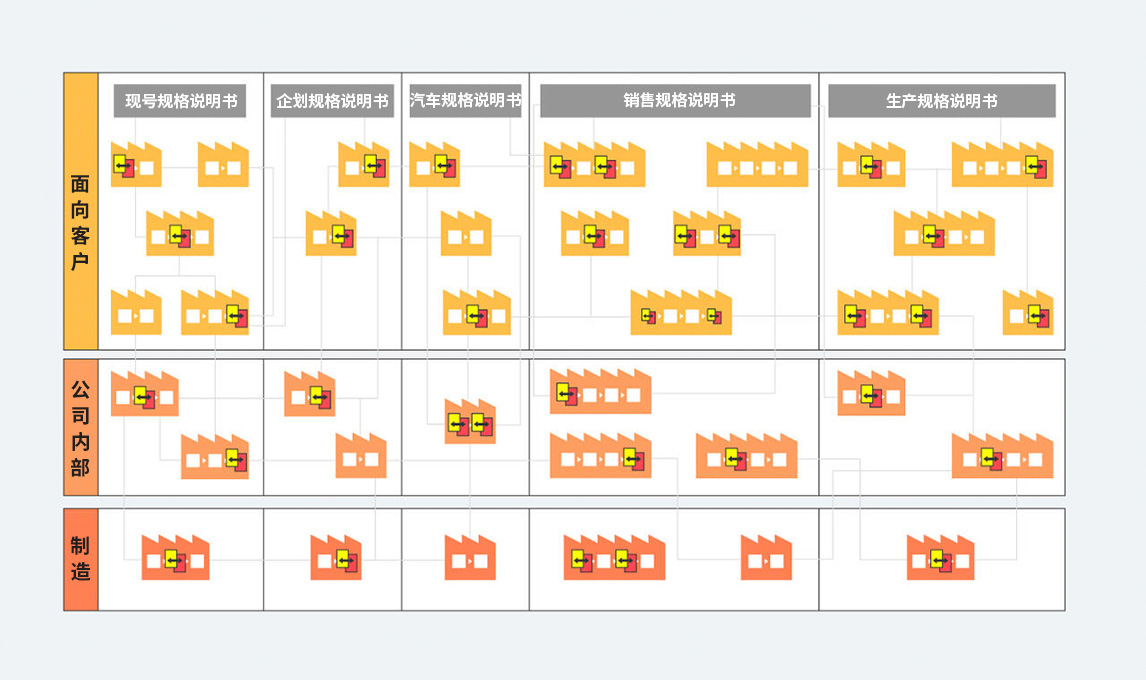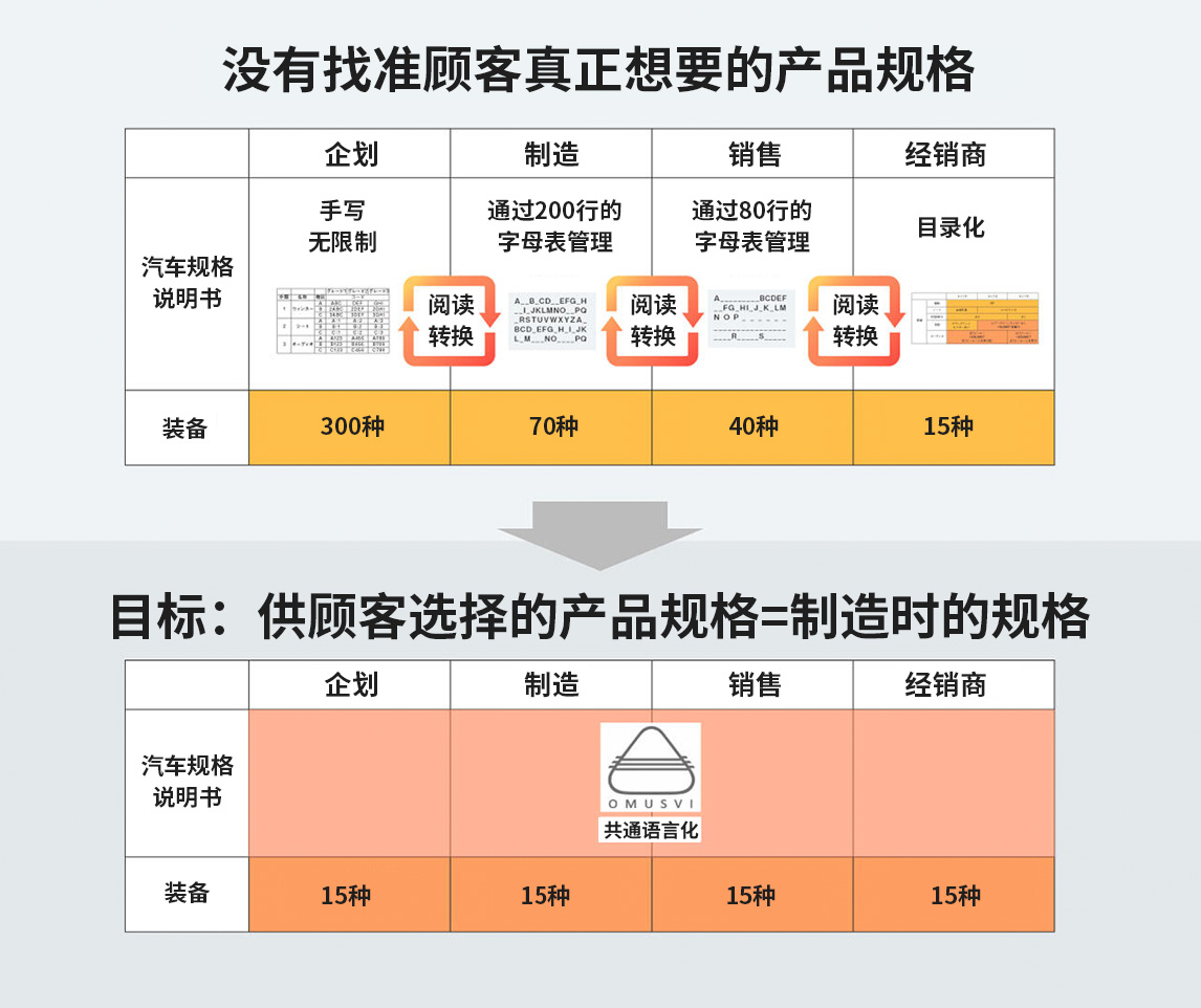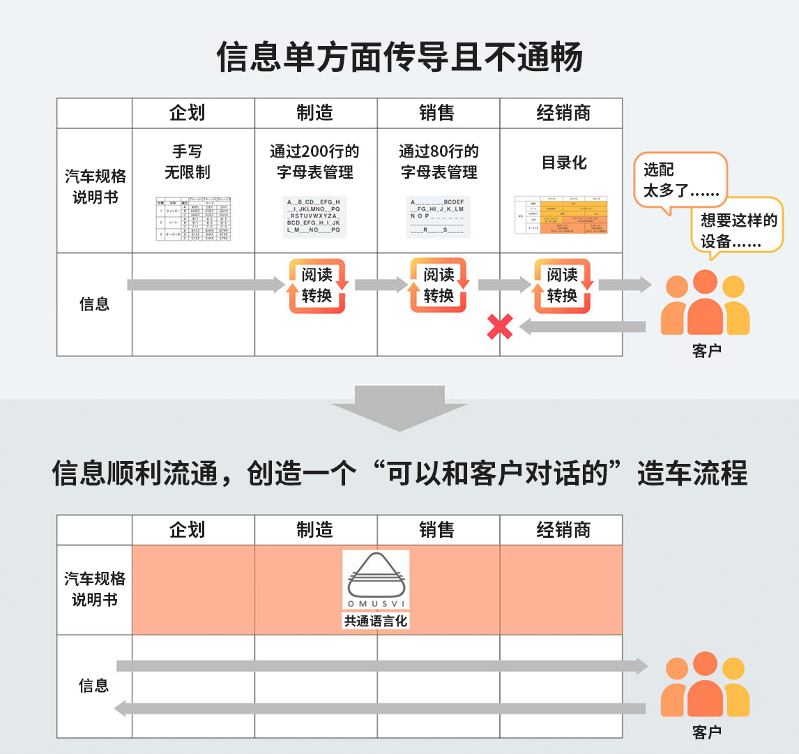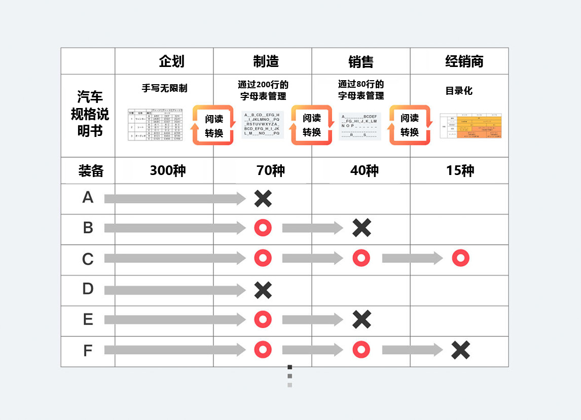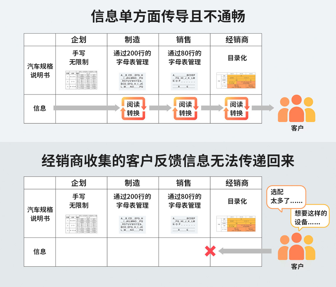 最初,规格说明书的“语言”是针对每个部门和每种车型进行最优化设计的,这就意味着经销商那边收到的客户反馈信息无法及时通过销售和生产环节传达到位于流程顶端的企划阶段。