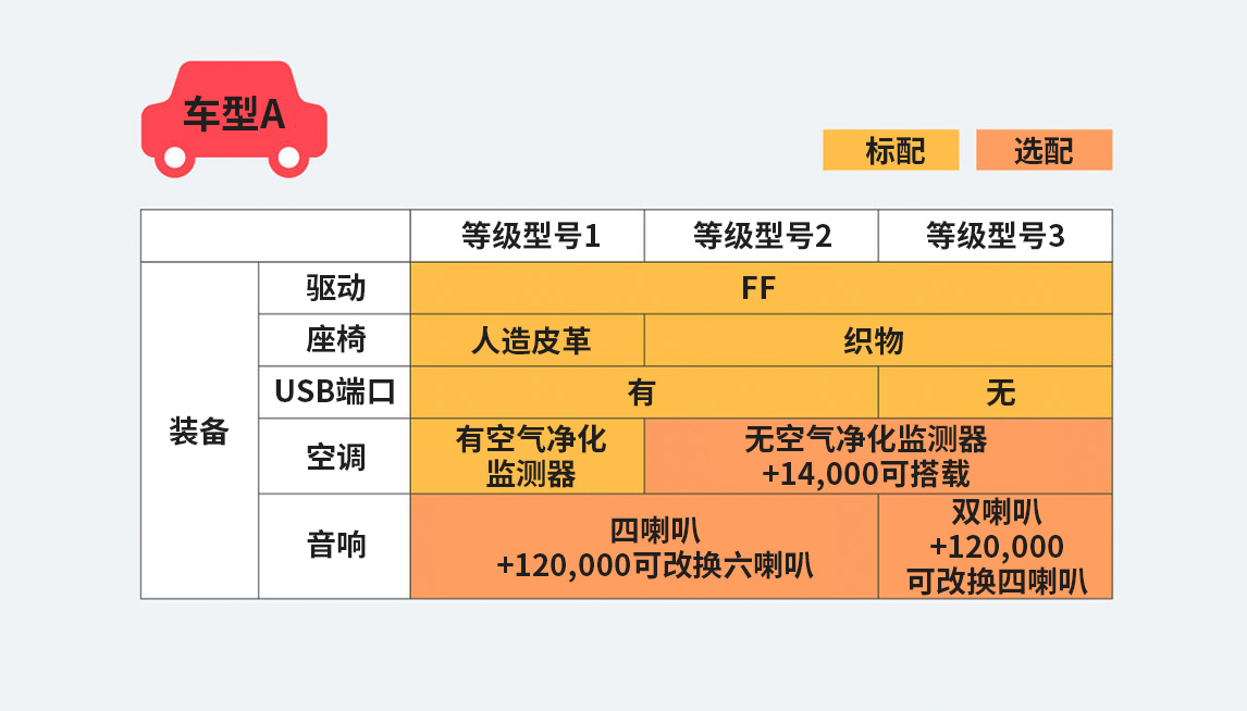 大家请看下图。这是从经销商的产品宣传目录中摘选的部分汽车标配和选配内容。