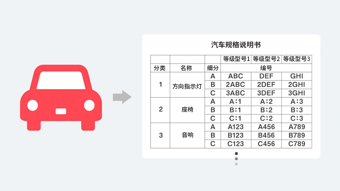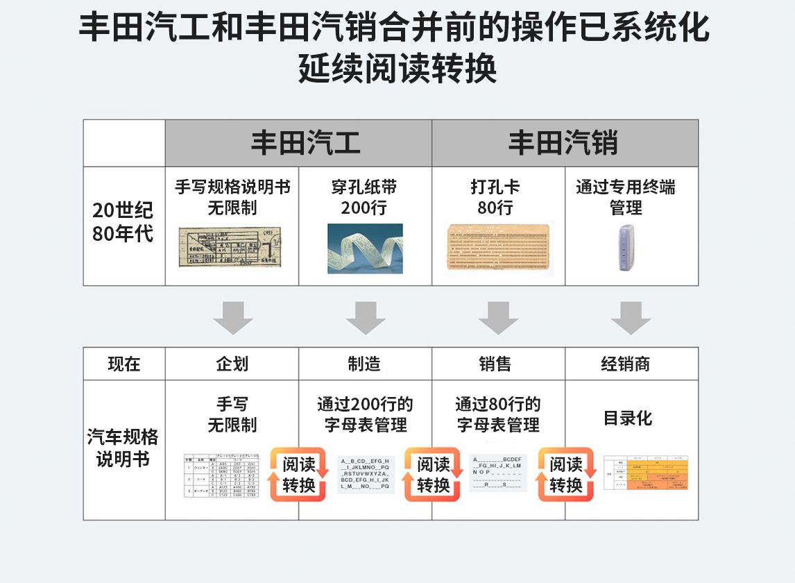 明明被记录的规格内容没有变化,却为何要进行转换呢?实际上,在20世纪80年代丰田汽车工业公司(丰田汽工)与丰田汽车销售公司(丰田汽销)合并前,各公司都有自己的规格记载形式,而合并时也并未统一,直接进行了系统化处理。