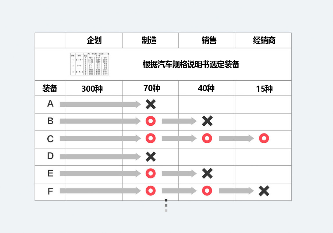 在制造汽车的过程中,有560道工序是根据汽车规格说明书进行作业的,其中195道工序涉及“阅读转换”。此外,如前文所述,在明确实际所需销售零件数之前,存在很多“非客户选配规格部分也需要进行‘阅读转换’”的情况。