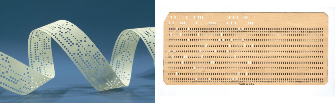 上图为穿孔纸带(左)和打孔卡(右)。根据孔的数量和位置记录和管理数据。