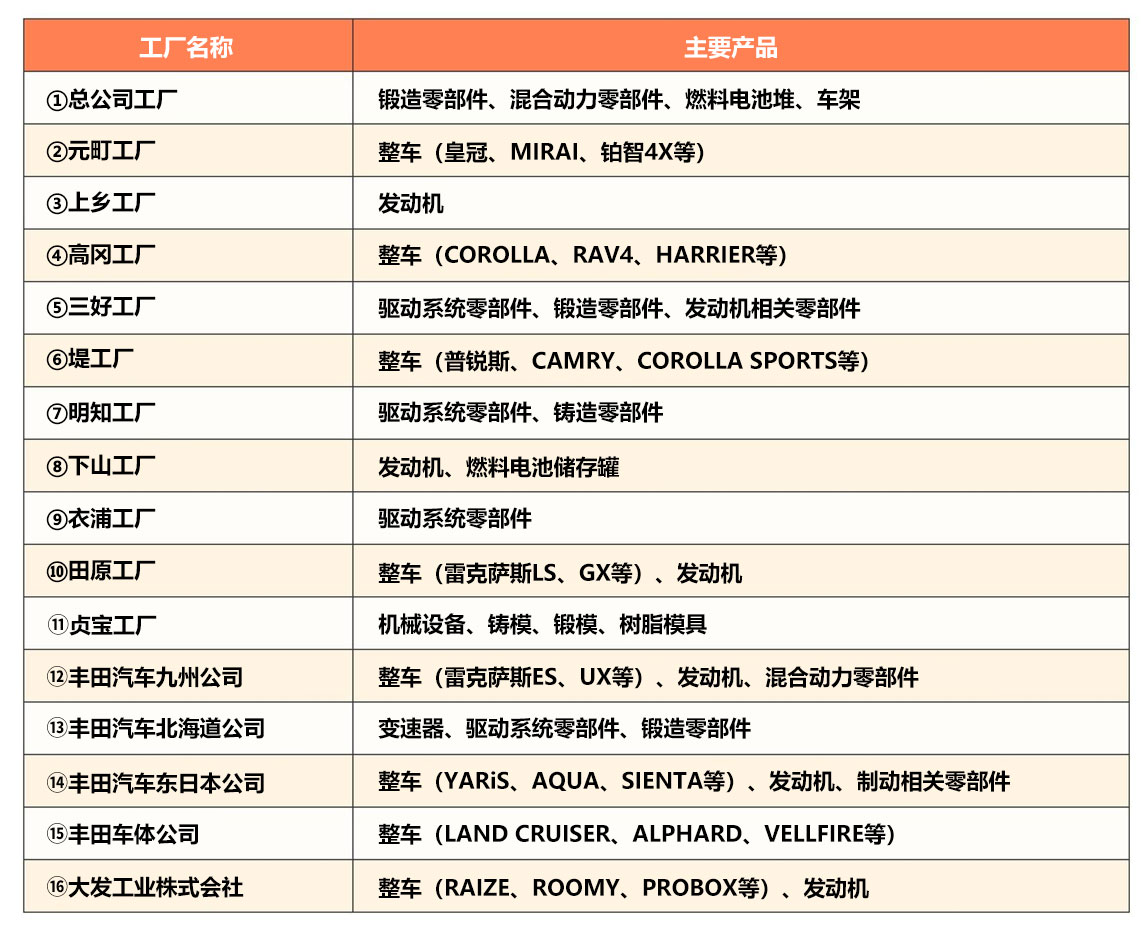 主要生产零件:发动机及变速器等零部件、MIRAI的燃料电池堆、普锐斯的混合动力机组、LAND CRUISER的车架等