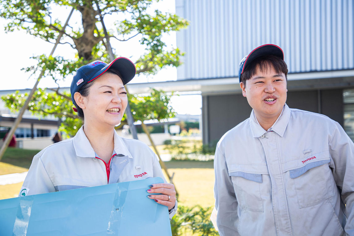 左侧:来自涂装成形部涂装课的原田奈美专家 右侧:来自涂装成形制造技术部CN推进室涂装战略组的藤本真也先生(现于高冈工厂涂装成形制造技术部车身涂装技术室涂装生准1组)