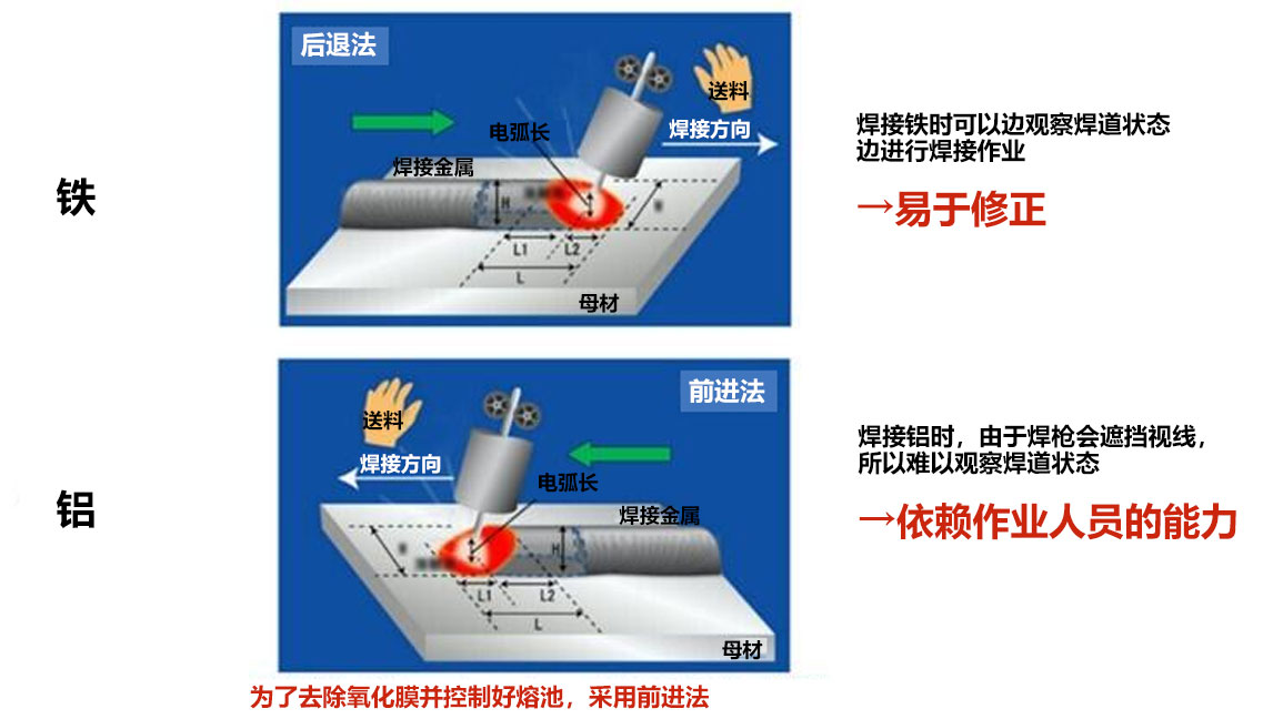 此外,铝容易形成氧化膜,这会干扰焊接作业。对于右撇子操作员而言,焊接铝时要确保焊接机从右向左移动。