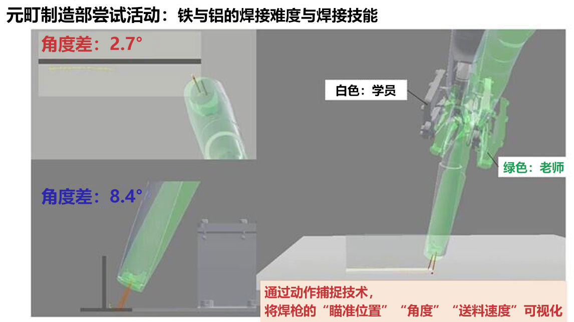 通过分别拍摄老师和学员的焊接过程,并在3D图纸上重现,可以立体且直观地确认二者间角度、瞄准位置等细微的动作差异。