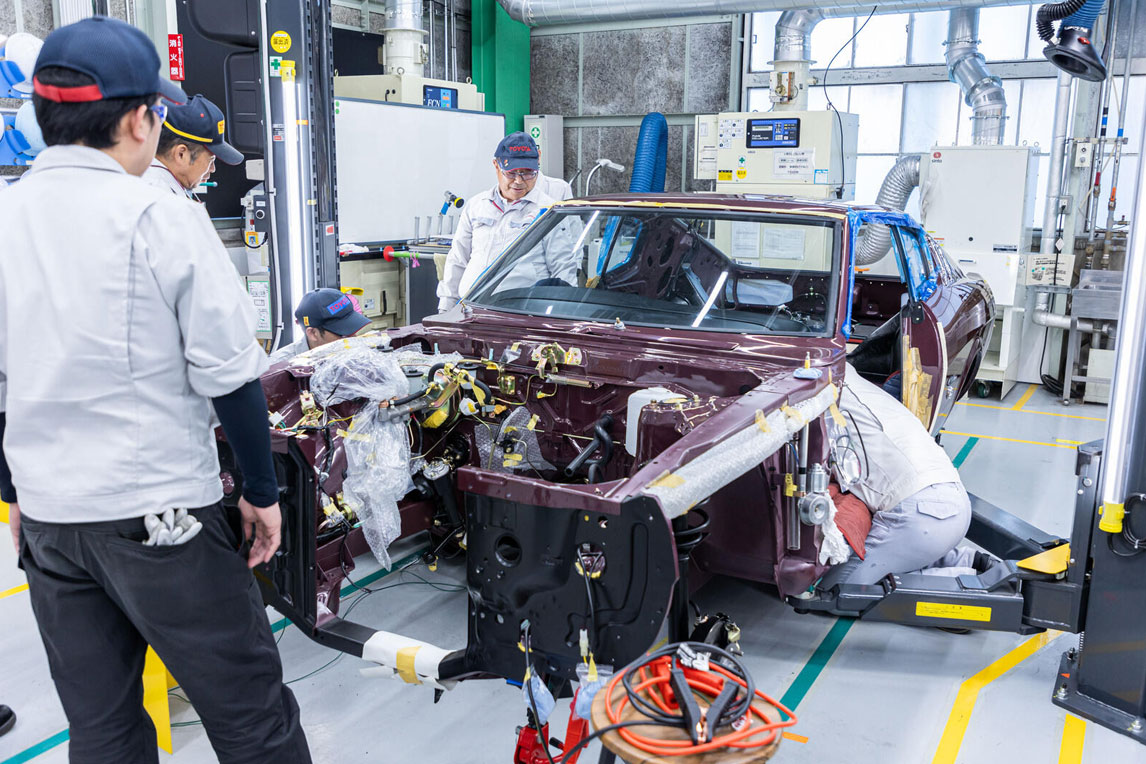 负责这项工作的是来自元町工厂的涂装团队,整个作业过程非常精细。他们首先将车身整体涂成白色,然后使用一种名为“刮板”的工具,在保留红色部分的情况下进行遮蔽作业并涂装。最后,使用黑色颜料通过与上述相同的步骤完成涂装。