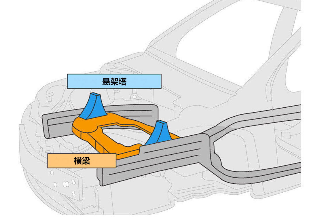 BEV为了安装电机,会在悬架塔之间加入横梁连接。这样可以防止悬架倾斜,从而抑制路噪。据说这种设计在前驱车型中尤为有效。