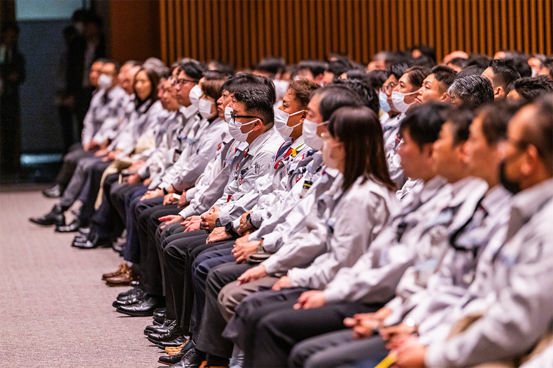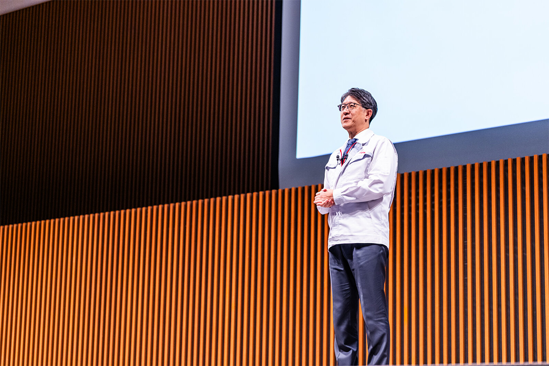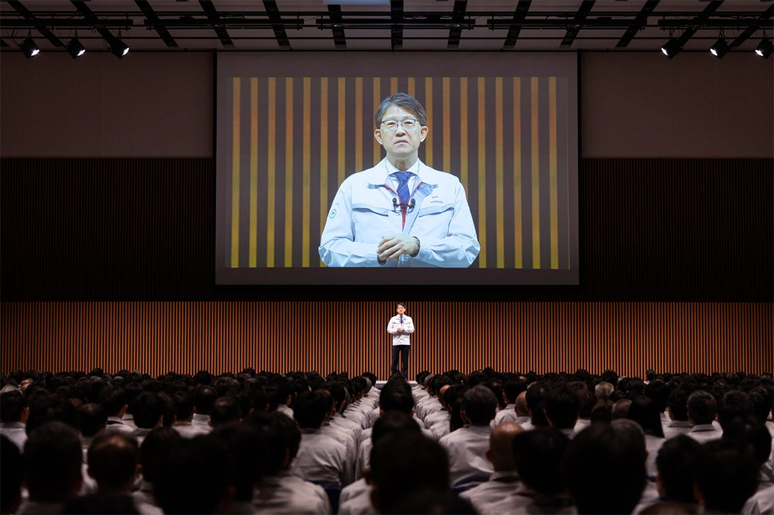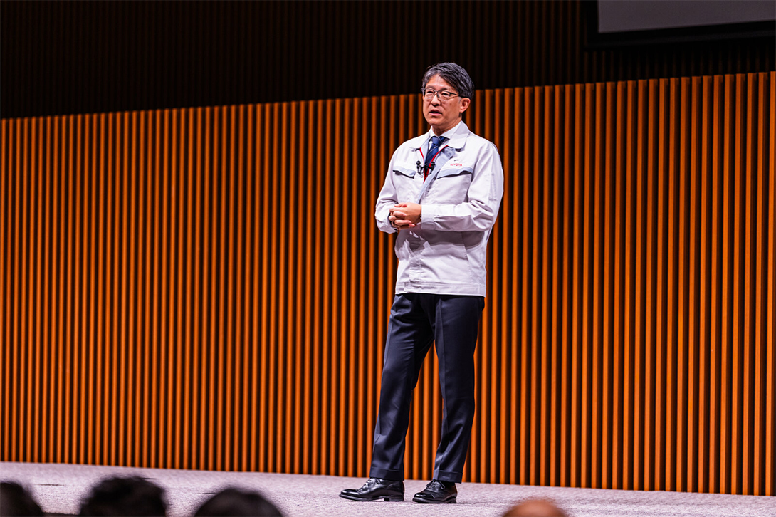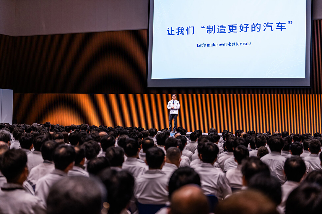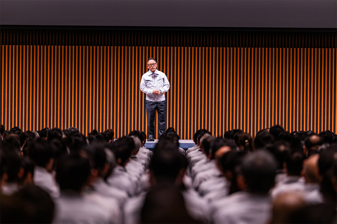 总务・人事本部长山本正裕在会议开场时向员工们说道:“一直以来,(丰田)会长和(佐藤)社长的话语,对我们每个人而言,都是一种能点燃心中火焰的激励。”随后,佐藤社长登台致辞。