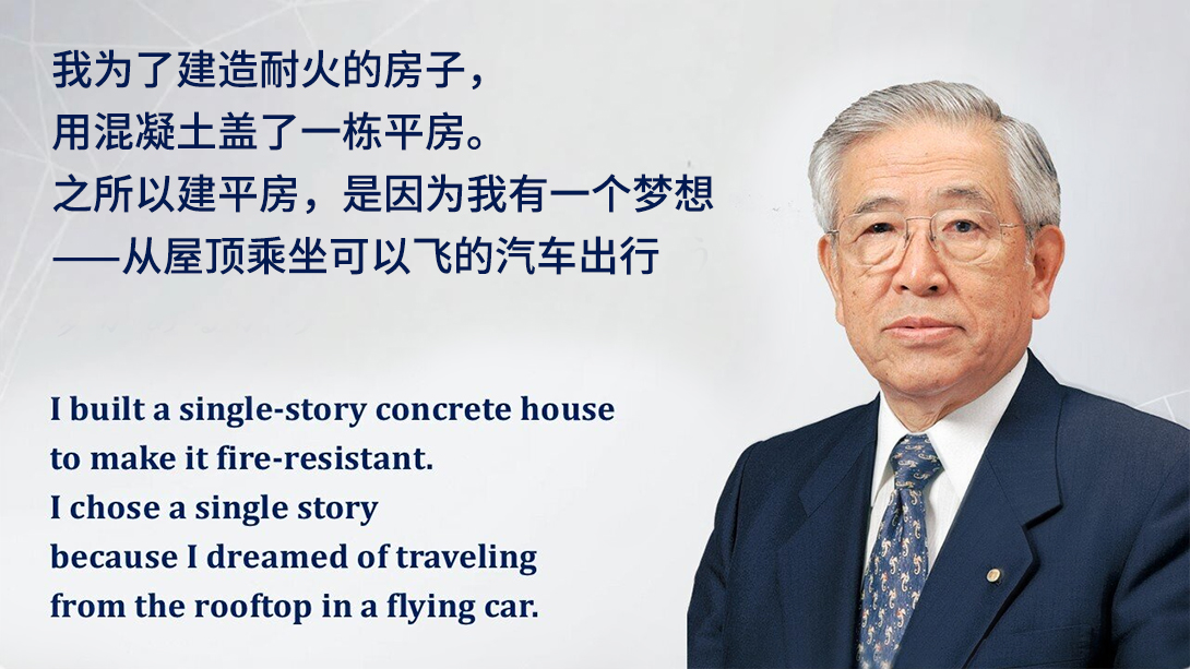 “我为了建造耐火的房子,用预制混凝土建造平房。之所以建平房,是因为我有一个梦想——从屋顶乘坐可以飞的汽车出行,希望大家也不要忘记梦想,努力大干一场。”