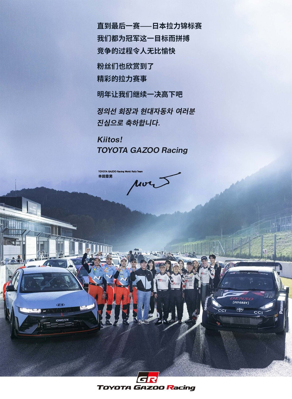 其实,从2024年开始,两家公司就通过报纸广告互相为对方加油鼓劲。在争夺厂商年度冠军的最后一赛——日本拉力锦标赛结束后的第二天,Morizo便向郑义宣会长及现代汽车的各位传达了这样的信息。