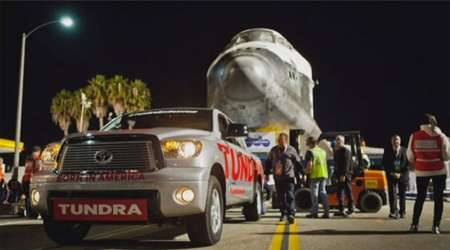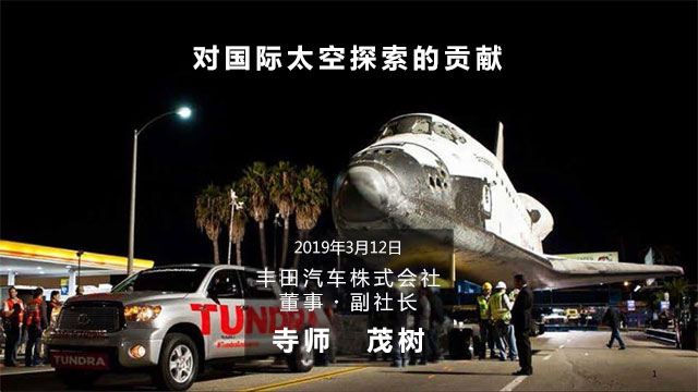 首先,介绍一下我们丰田公司第一次接触和太空相关工作时候的情形。这张照片是2012年奋进号航天飞机退役时,从洛杉矶机场运输到加利福尼亚科学中心的时候,我们(我们的车辆作为牵引车)公司负责牵引这条路的一部分路程。照片中是一辆在德克萨斯制造的名为坦途的大皮卡,虽然牵引的距离不长,但我们做了一项非常光荣的工作。