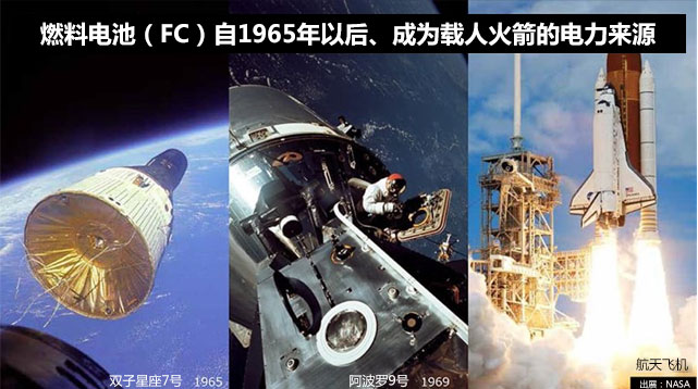 从这里开始,我想就丰田贡献的技术中燃料电池的部分说几句。燃料电池并不是新技术。1965年双子星座计划以后,在阿波罗和航天飞机上,就开始使用氢能和燃料电池作为能源。