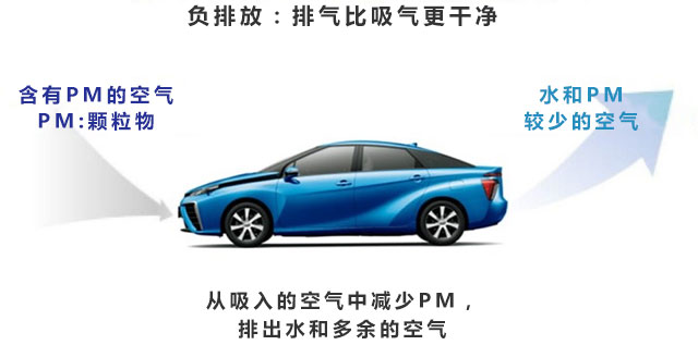 MIRAI吸入空气,通过过滤器进行清洁,氧与氢结合在一起发生电化反应,从而产生电能,电能驱动电机运转,汽车行驶。实际上,排出的是水和剩下的空气,不过,因为安上了过滤功能,吸入pM2.5,排出的时候,pM2.5会大大降低。