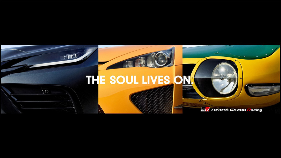 从右至左依次是2000GT、雷克萨斯LFA,以及仍处于保密状态的第三款车型。广告语写着“THE SOUL LIVES ON.(灵魂永续)”。如今这个弯道已被称作“GR GT弯道”了!