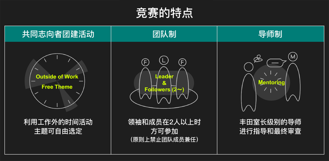 丰田集团每年约有100名员工参加A-1并提出自己的商业创意,创意的范围非常广泛,不局限于汽车。