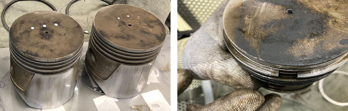 成员们将发动机完全分解后,仔细检查拆卸下来的活塞、活塞环、机油环,发现这些零件的表面都出现了很大的伤痕,还发现了多处带有积碳(黑煤印记)的地方。