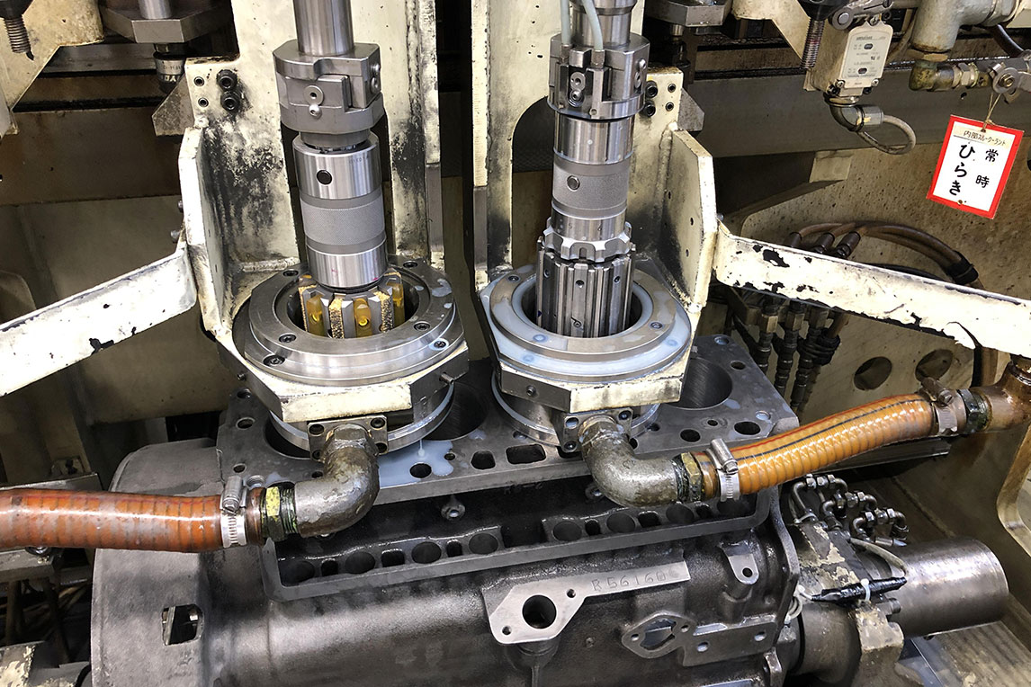 具体来说就是在珩磨机的珩磨头(工具)上安装多个珩磨条,用珩磨头反复打磨被固定住的发动机组气缸内壁,使内壁的表面能够得到微米级单位的研磨加工,最终呈现出最合适的形状。这项精密的加工工序,对发动机的综合性能将起到决定性作用,可以说是制造发动机技术的精髓所在。