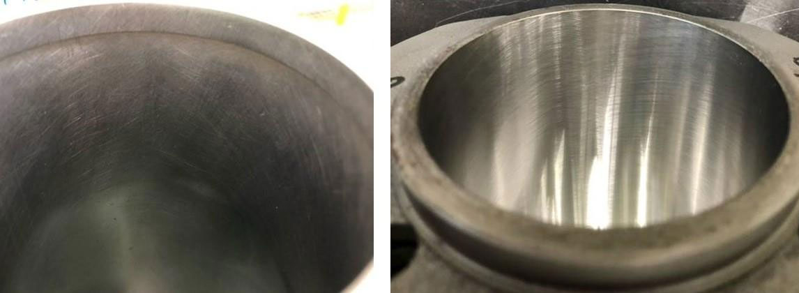近距离一看,加工前后气缸内壁的差异显而易见。如果仔细观察加工前的内壁表面,可以看到切削工具造成的细小痕迹,而加工后的内壁则光亮如镜。