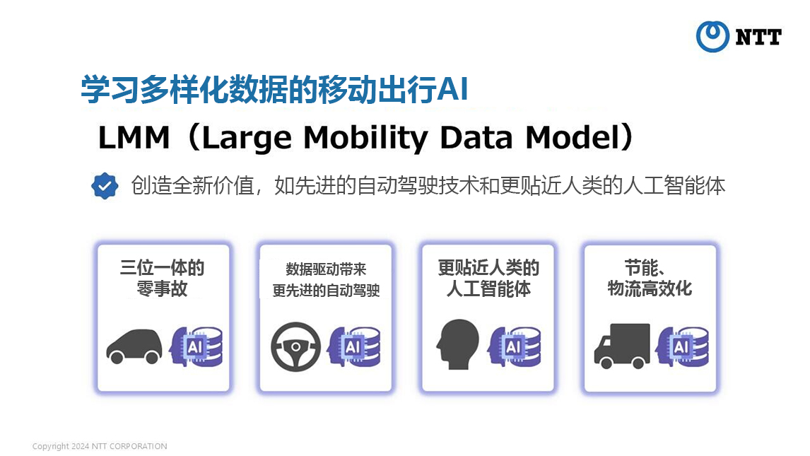 NTT的岛田明社长解释道:“通过结合AI技术,我们将创建一个拥有各种移动出行服务的富裕社会,如零交通事故、先进的自动驾驶以及更贴近人类的人工智能体”。此外,他还就相关内容作出了如下介绍。