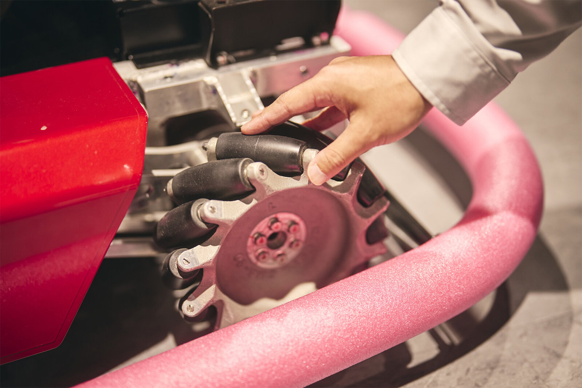 因为卡丁车游戏中也能旋转和漂移,所以为了真实还原游戏,并让孩子们能更安全且简单地体验到这些,我们决定为FUNVE安装麦克纳姆轮。